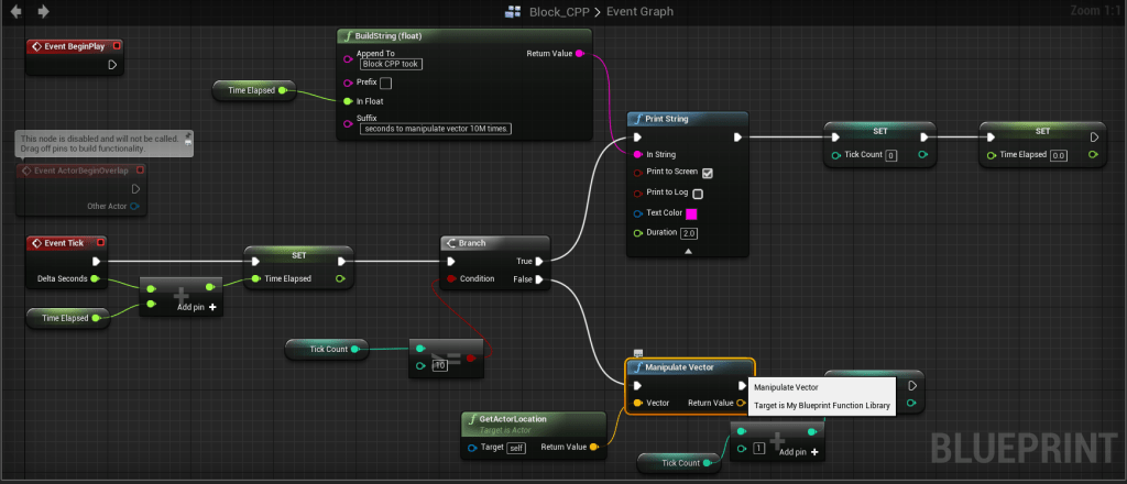 In this example, there are two identical actor objects. Both of them are of BP Actor class and have the same behavior. The only difference is that one does computation with all BP nodes and the other does computation all in C++.